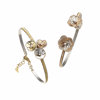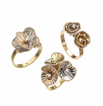The Cenzi Vittorio company celebrates natural femininity, and encourages free association according to nature: lightly-shaped jewelry, juxtaposed imaginatively, which evokes the elegance of leaves caressed by the breeze, the eternal beauty of blooms which never fade, the rarity of shells offered up as precious gifts from the ocean.The explosive force of the gold surfaces is expressed via the combination of fashion-forward colour, decorative designs and shining diamond-cut surfaces, expressions of constantly developing creativity.