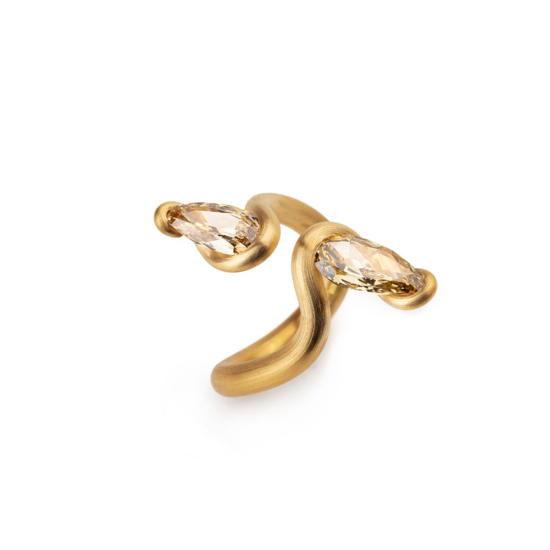 The form of a snake is revealed in all its symbolic power in a creation made of sinuous gold lines culminating in the tapered shapes of two brown diamonds.