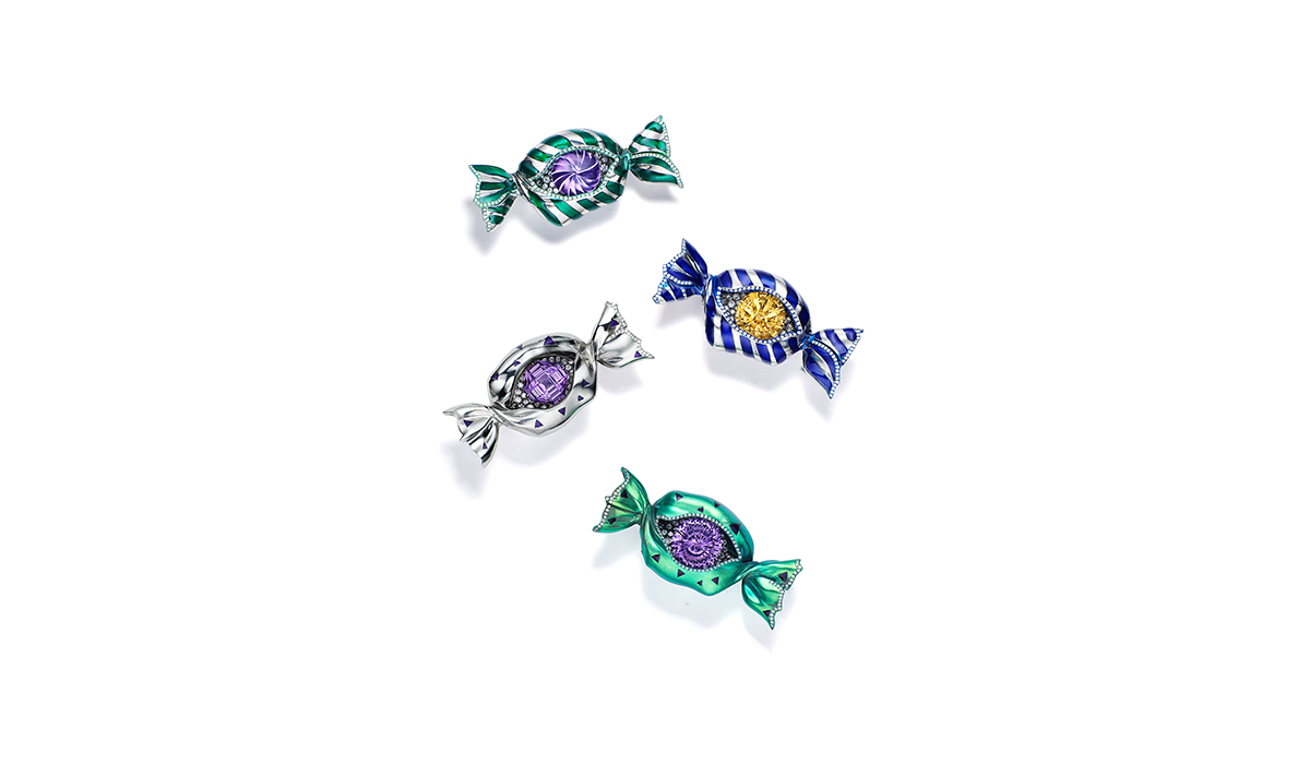 A titanium and enamel brooch in the hyper-realistic shape of a candy containing precious stones such as Sri Lankan sapphire, Brazilian Paraiba tourmaline and Burmese spinel. It is the jewelry item that most reveals the imaginative world of the young up-and-coming Xiao Xintong AKA A.win Siu. Having grown up immersed in the rich heritage of Chinese craftsmanship, the designer founded her brand in 2017 in order to translate its intricate details and symbolism into a precious, pop and contemporary language. The result of an effervescent imagination combined with meticulous technique, her jewelry tells a story and arouses emotions through bold colors and surprising metal and mineral combinations.